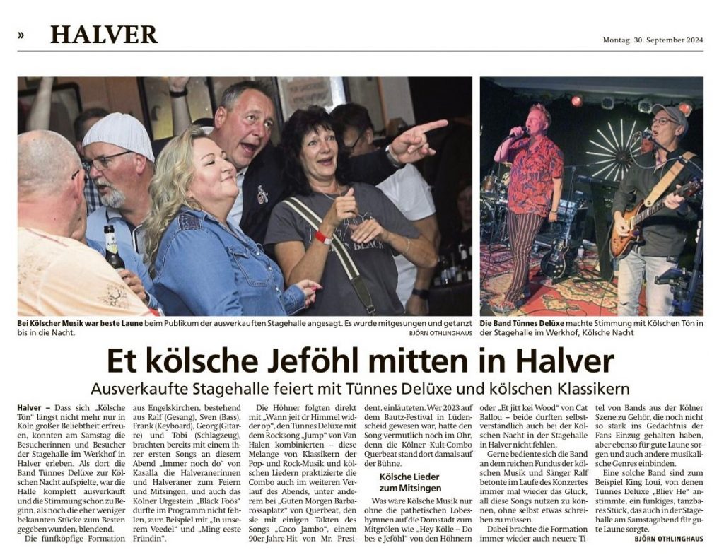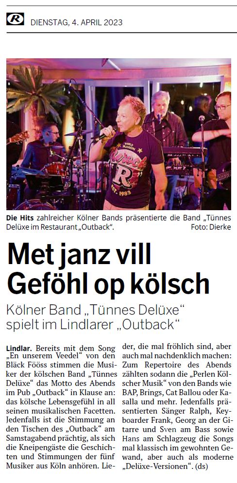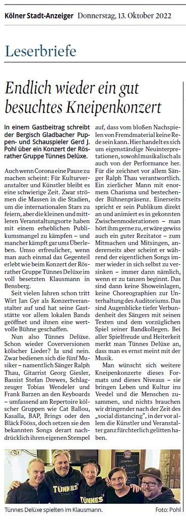 Presse Hier gibt’s eine kleine Presseschau zu Veranstaltungen, bei denen Tünnes Delüxe dabei war 😉 TDL – Schützenfest Rösrath (Bericht KStA, 06. September 2022)Herunterladen Pressestimmen TDL – Benefizkonzert Rösrath packt an (Ankündigung KStA, 28. Juli 2021)Herunterladen TDL – Benefizkonzert Rösrath packt an (KStA, 03. August 2021)Herunterladen TDL – Benefizkonzert Rösrath packt an (Rundblick Rösrath, 06. August 2021)Herunterladen TDL – Benefizkonzert Rösrath packt an (Rundblick Rösrath, 20. August 2021)Herunterladen TDL – Rösrath Hopp (KStA, 28. Juni 2021)Herunterladen TDL – Rösrath Hopp (Rundblick Rösrath, 09. Juli 2021)Herunterladen TDL – Rösrath Hopp (Rundblick Rösrath, 23. Juli 2021)Herunterladen